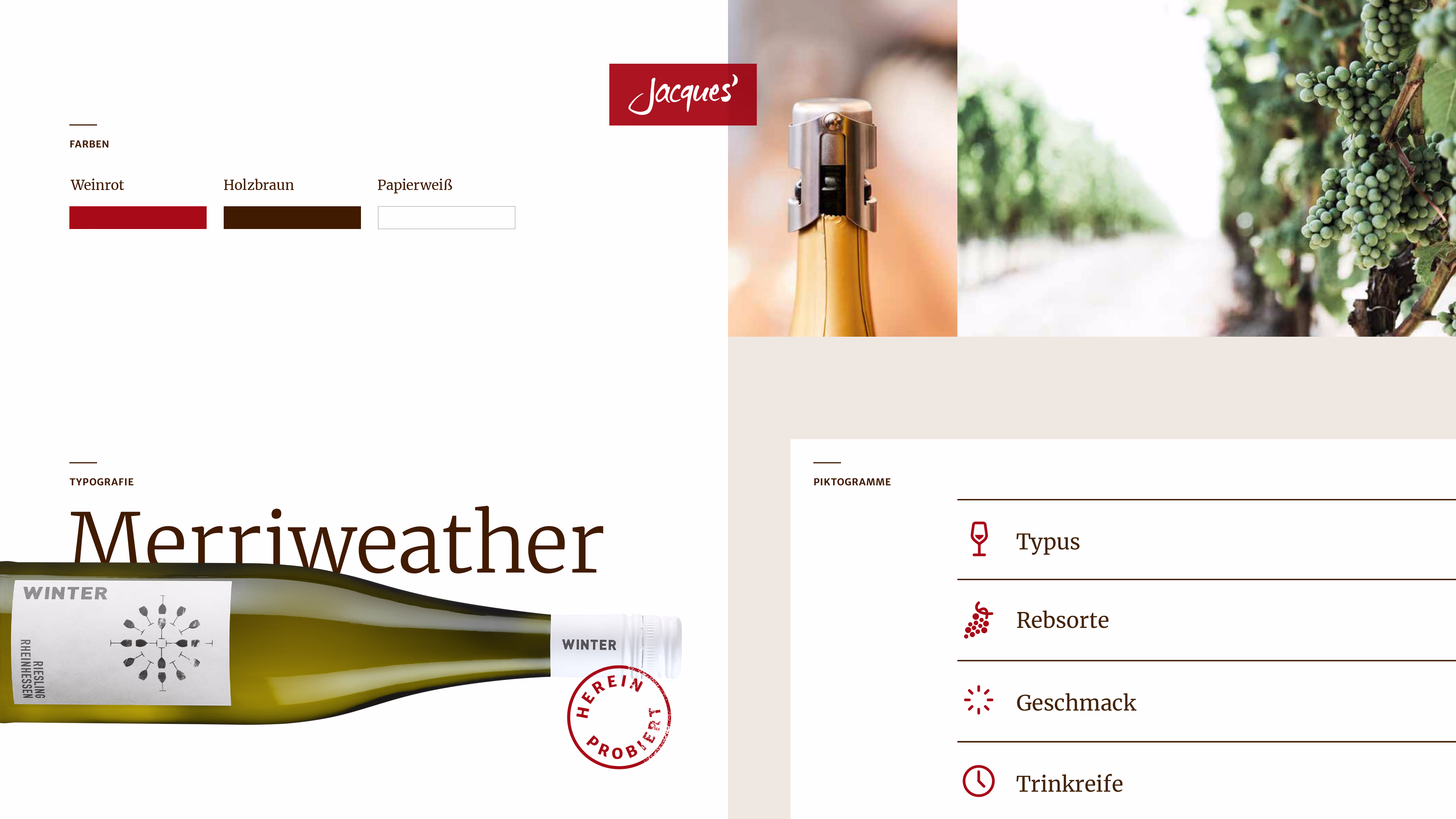 The primary colors are derived from the world of wine: wine red as the color of the wine, wood brown as the color of the vines and wine barrels, and paper white as the label on each wine bottle.